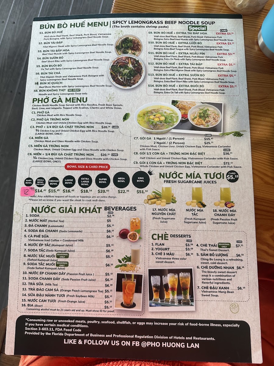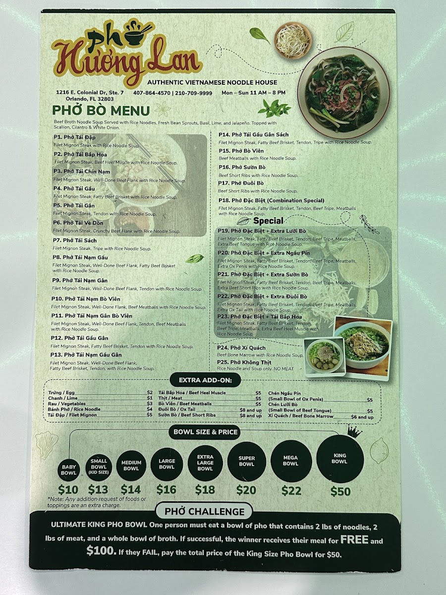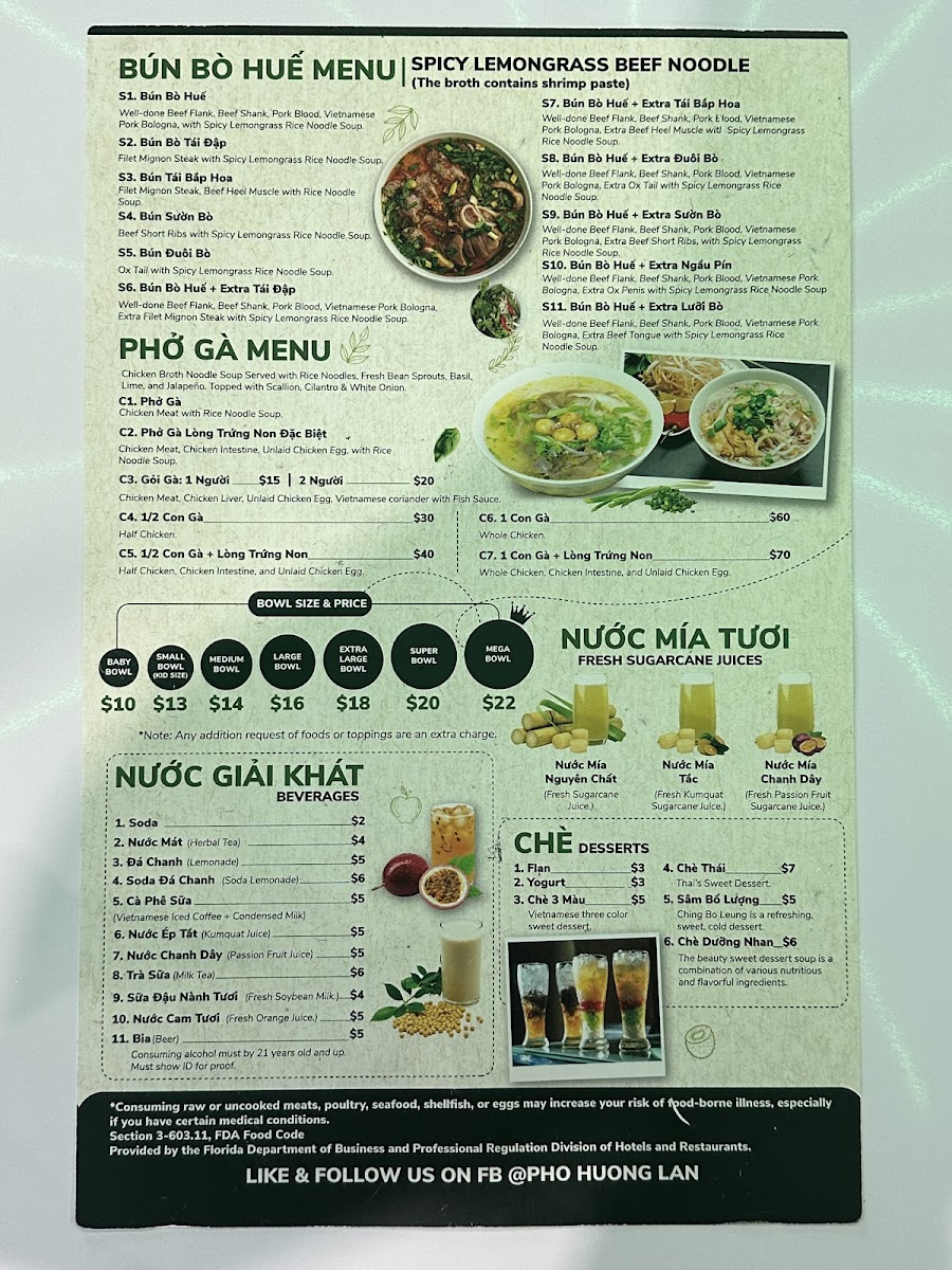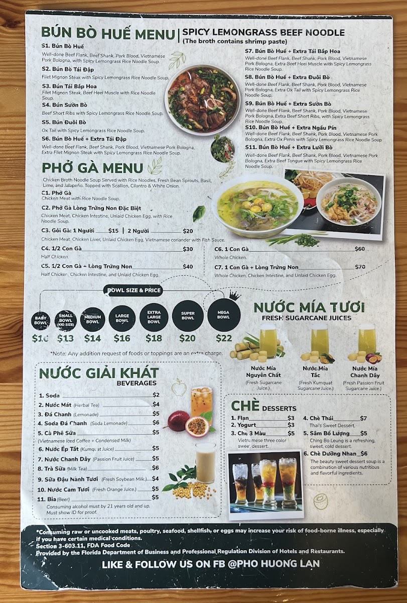 Welcome to Pho Huong Lan, a gem nestled in Orlando, Florida, renowned for its authentic Vietnamese pho and rich flavors. The menu showcases classic dishes like Bún Bò Huế and Phở Gà, each prepared with fresh ingredients and traditional recipes. Highlights include the Spicy Lemongrass Beef Noodle and the signature Pho Dac Biet, both celebrated for their intensely flavored broth and high-quality beef sourced from California.