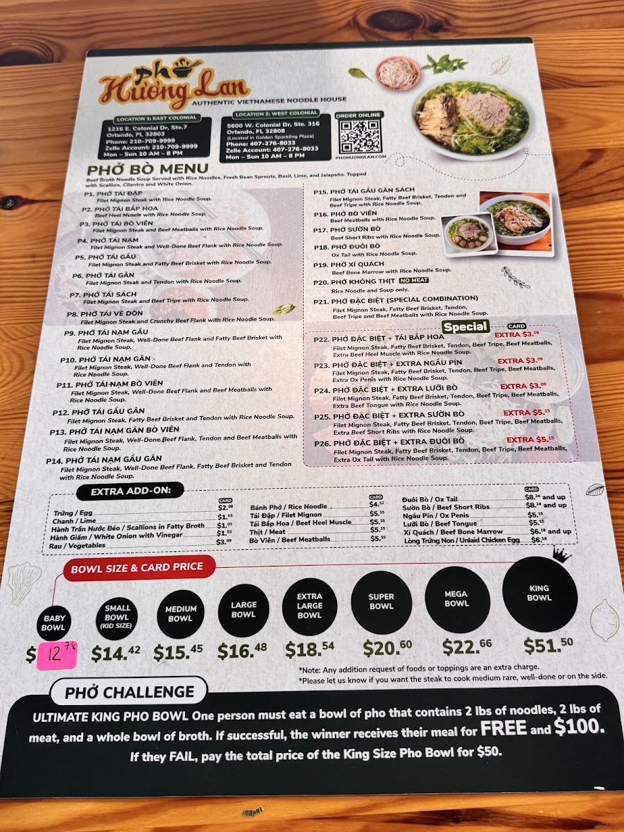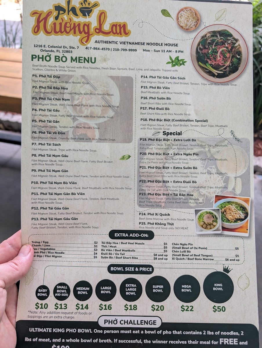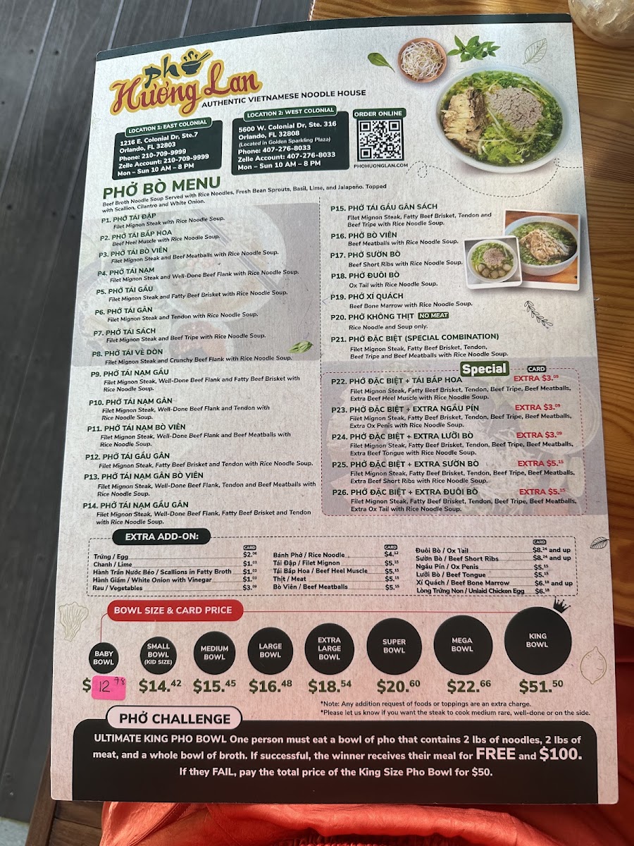 Welcome to Pho Huong Lan, a gem nestled in Orlando, Florida, renowned for its authentic Vietnamese pho and rich flavors. The menu showcases classic dishes like Bún Bò Huế and Phở Gà, each prepared with fresh ingredients and traditional recipes. Highlights include the Spicy Lemongrass Beef Noodle and the signature Pho Dac Biet, both celebrated for their intensely flavored broth and high-quality beef sourced from California.